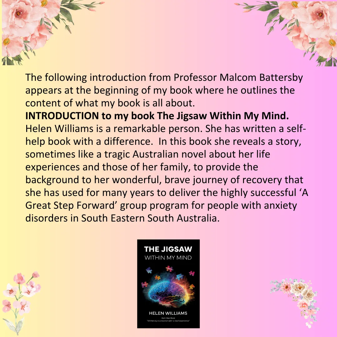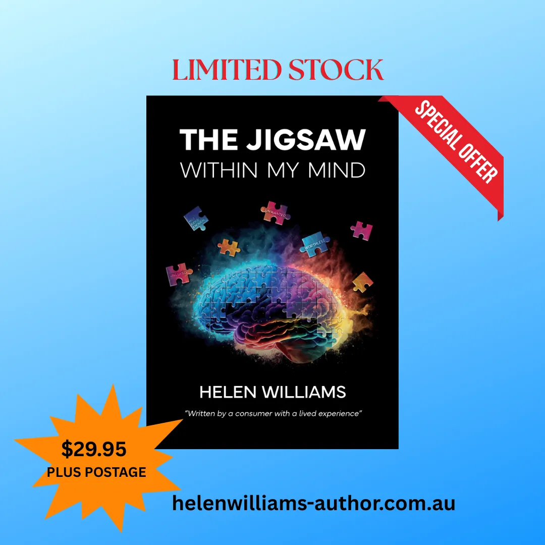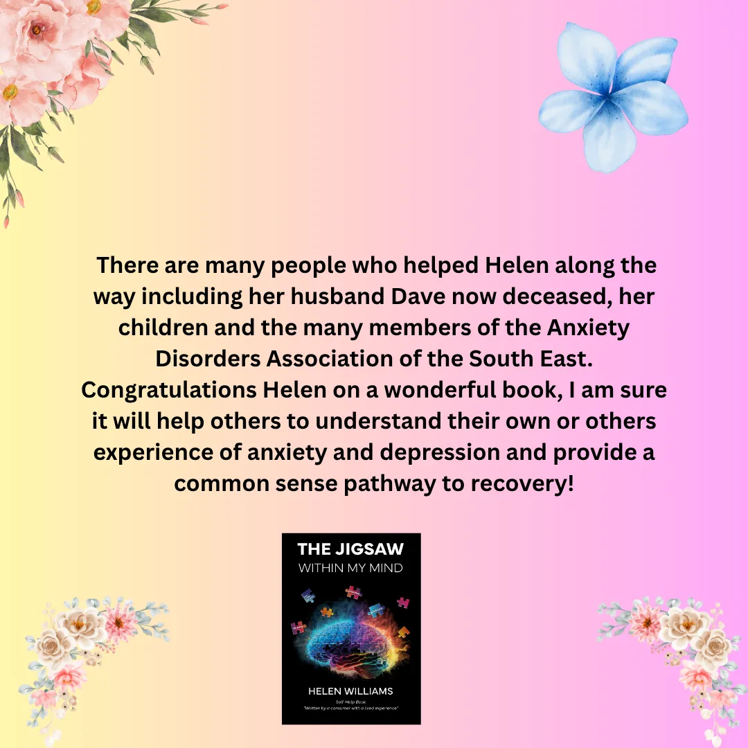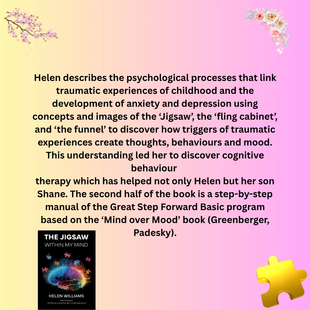 "Jigsaw Within My Mind outlines my journey in life with Anxiety Disorders and Depression. I found my pathway to recovery when I discovered Cognitive Behaviour Therapy and the missing Jigsaw pieces hidden in the timelines of my life, as well as members of my family." Helen Williams