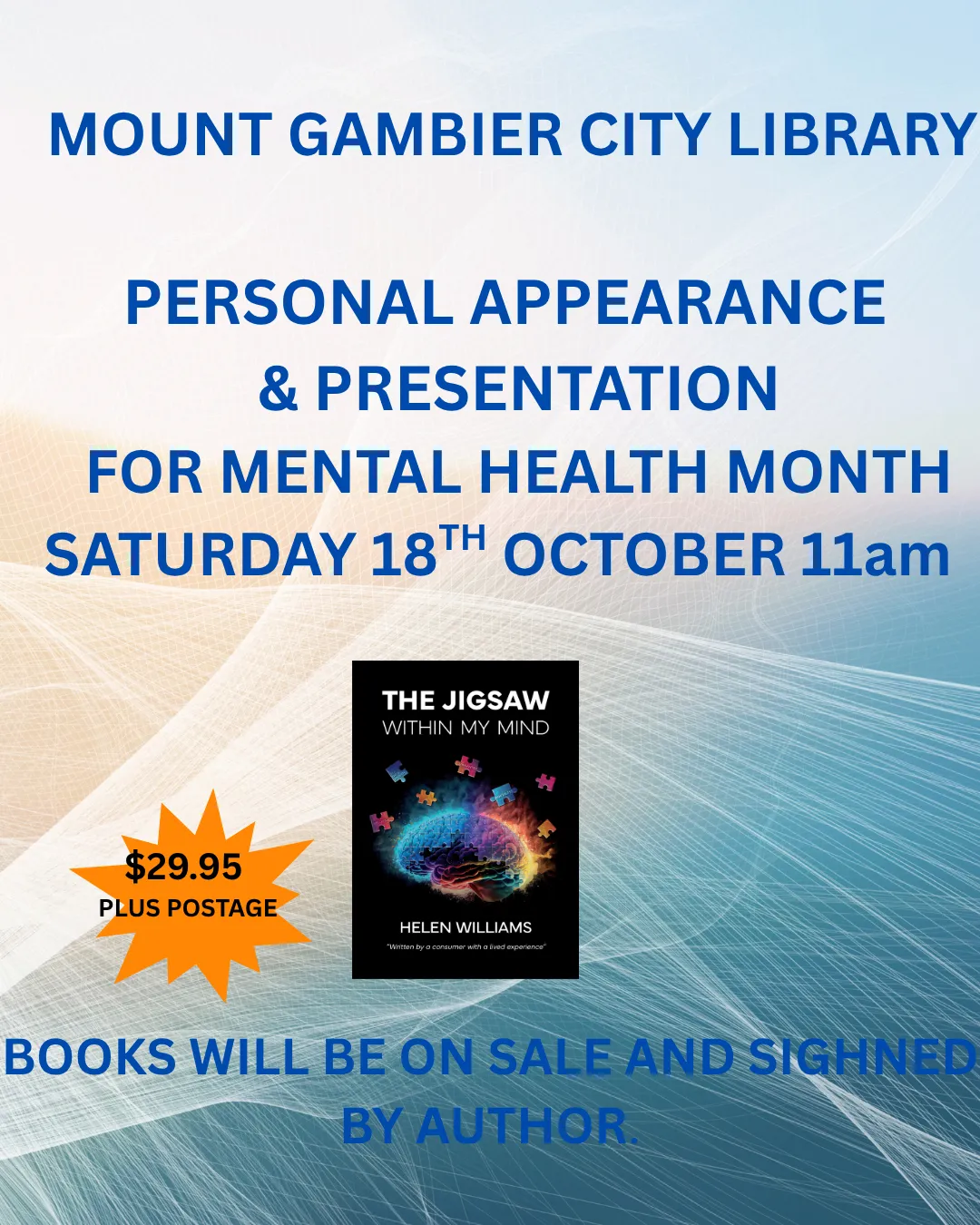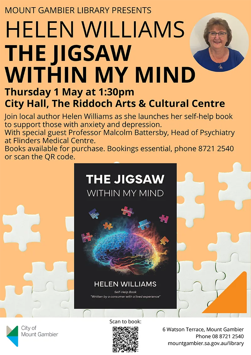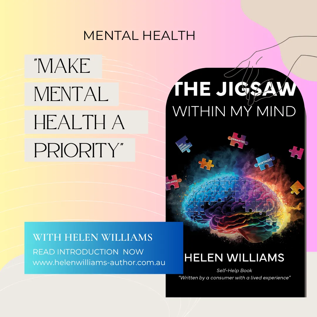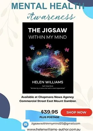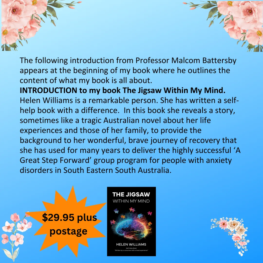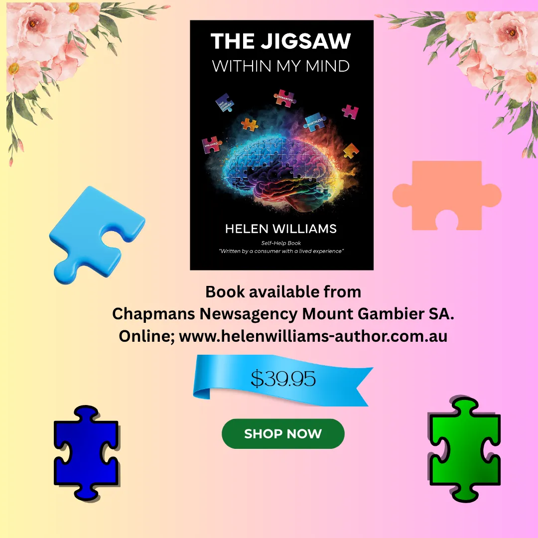 "Jigsaw Within My Mind outlines my journey in life with Anxiety Disorders and Depression. I found my pathway to recovery when I discovered Cognitive Behaviour Therapy and the missing Jigsaw pieces hidden in the timelines of my life, as well as members of my family." Helen Williams